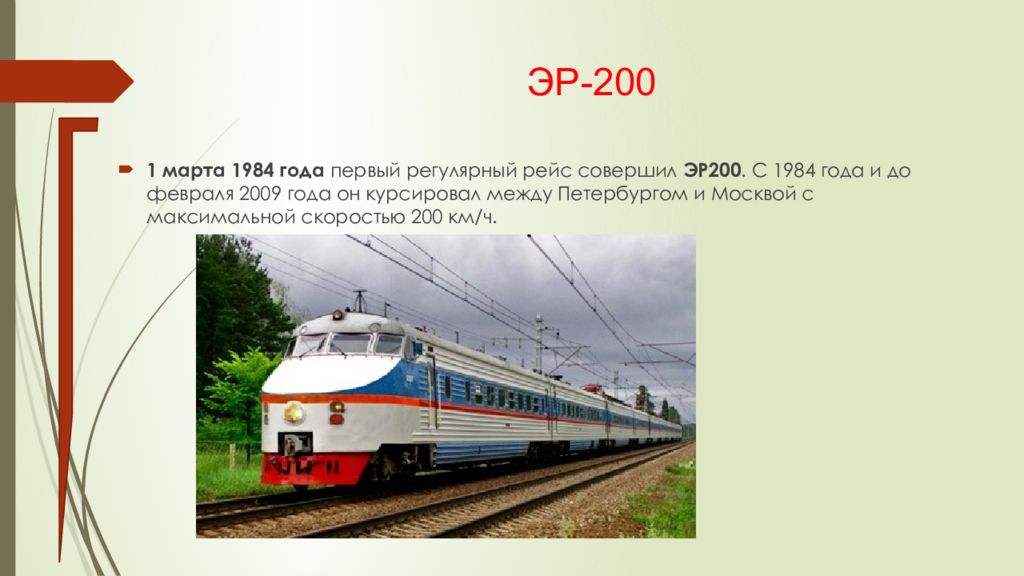 1 марта 1984 года первый регулярный рейс совершил ЭР200. С 1984 года и до февраля 2009 года он курсировал между Петербургом и Москвой с максимальной скоростью 200 км/ч.