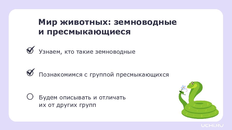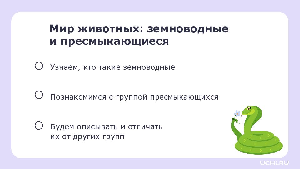 Мир животных: земноводные и пресмыкающиеся Узнаем, кт о такие земноводные Познакомимся с группой пресмыкающихся Будем описывать и отличать их от других групп