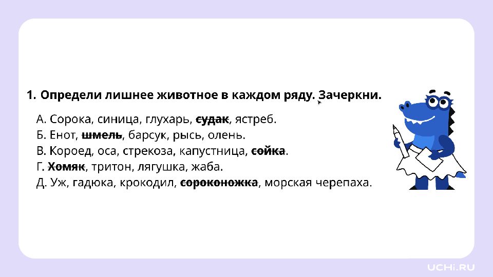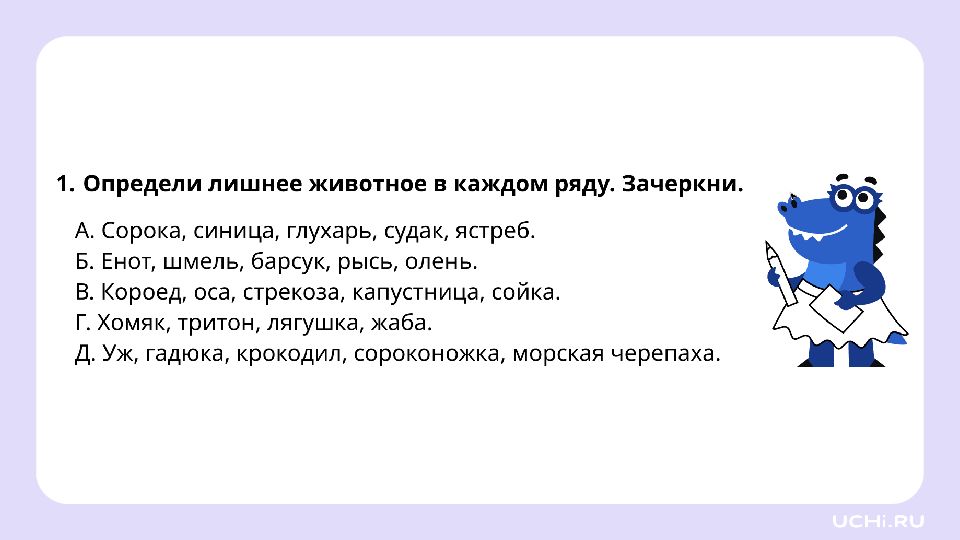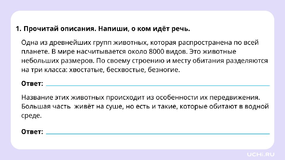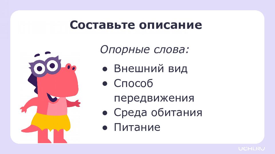 Составьте описание Опорные слова: Внешний вид Способ передвижения Среда обитания Питание