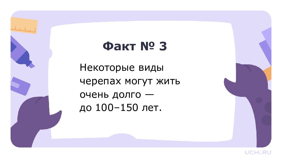 Факт № 3 Некоторые виды черепах могут жить очень долго — до 100–150 лет.