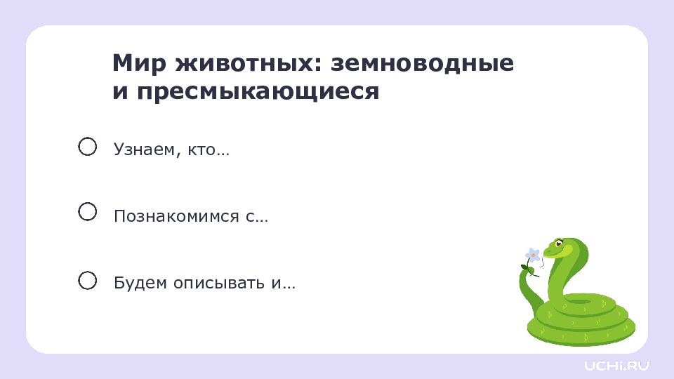 Мир животных: земноводные и пресмыкающиеся Узнаем, кто… Познакомимся с… Будем описывать и…