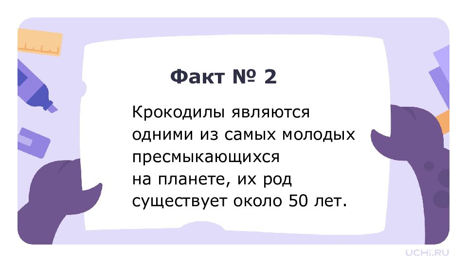 Факт № 2 Крокодилы являются одними из самых молодых пресмыкающихся на планете, их род существует около 50 лет.
