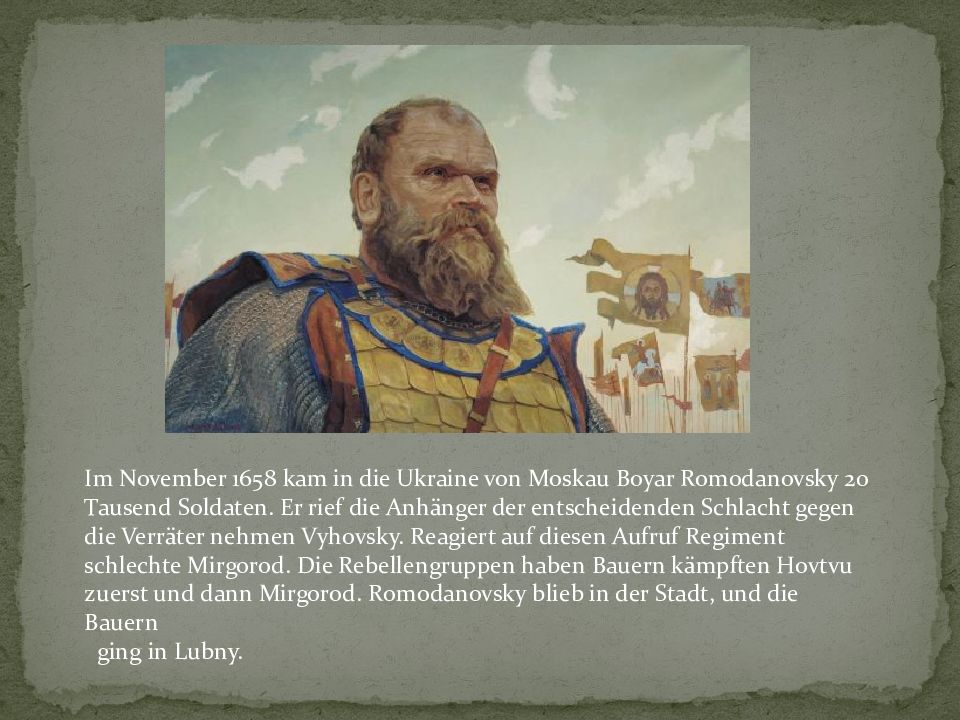 Im November 1658 kam in die Ukraine von Moskau Boyar Romodanovsky 20 Tausend Soldaten. Er rief die Anhänger der entscheidenden Schlacht gegen die Verräter nehmen Vyhovsky. Reagiert auf diesen Aufruf Regiment schlechte Mirgorod. Die Rebellengruppen haben Bauern kämpften Hovtvu zuerst und dann Mirgorod. Romodanovsky blieb in der Stadt, und die Bauern ging in Lubny.