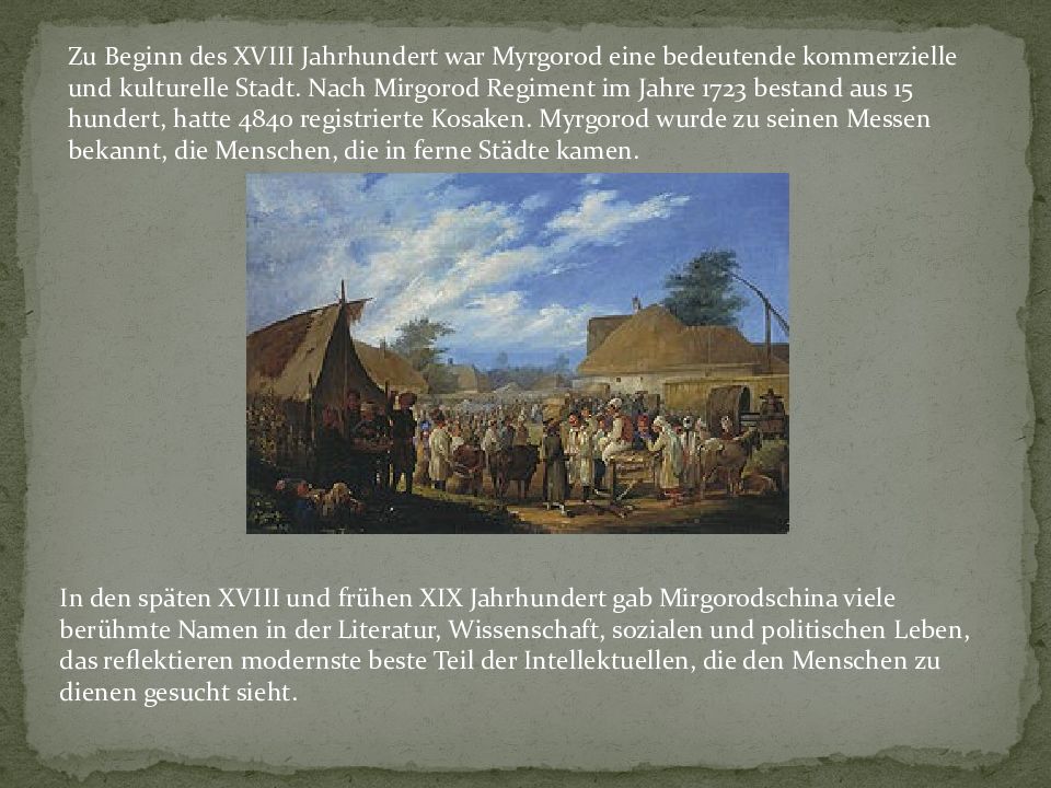Zu Beginn des XVIII Jahrhundert war Myrgorod eine bedeutende kommerzielle und kulturelle Stadt. Nach Mirgorod Regiment im Jahre 1723 bestand aus 15 hundert, hatte 4840 registrierte Kosaken. Myrgorod wurde zu seinen Messen bekannt, die Menschen, die in ferne Städte kamen. In den späten XVIII und frühen XIX Jahrhundert gab Mirgorodschina viele berühmte Namen in der Literatur, Wissenschaft, sozialen und politischen Leben, das reflektieren modernste beste Teil der Intellektuellen, die den Menschen zu dienen gesucht sieht.