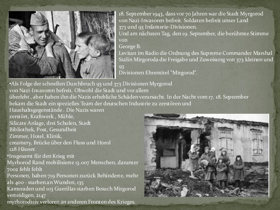 18. September 1943, dass vor 70 Jahren war die Stadt Myrgorod von Nazi-Invasoren befreit. Soldaten befreit unser Land 373 und 93 Infanterie-Divisionen. Und am nächsten Tag, den 19. September, die berühmte Stimme von George B. Levitan im Radio die Ordnung des Supreme Commander Marshal Stalin Mirgoroda die Freigabe und Zuweisung von 373 kleinen und 93 Divisionen Ehrentitel " Mirgorod ". Als Folge der schnellen Durchbruch 93 und 373 Divisionen Myrgorod von Nazi-Invasoren befreit. Obwohl die Stadt und vor allem überlebt, aber haben ihn die Nazis erhebliche Schäden verursacht. In der Nacht vom 17. 18. September bekam die Stadt ein spezielles Team der deutschen Industrie zu zerstören und Haushaltsgegenstände. Die Nazis waren zerstört, Kraftwerk, Mühle, Silicate Anlage, drei Schulen, Stadt Bibliothek, Post, Gesundheit Zimmer, Hotel, Klinik, creamery, Brücke über den Fluss und Horol 128 Häuser. Insgesamt für den Krieg mit Myrhorod Rand mobilisierte 13.007 Menschen, darunter 7002 fehlt fehlt Personen, haben 719 Personen zurück Behinderte, mehr als 400 - starben an Wunden, 135 Kameraden und 103 Guerillas starben Besuch Mirgorod verteidigen, 2147 myrhorodtsiv verloren an anderen Fronten des Krieges.