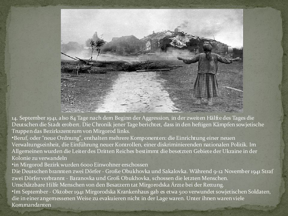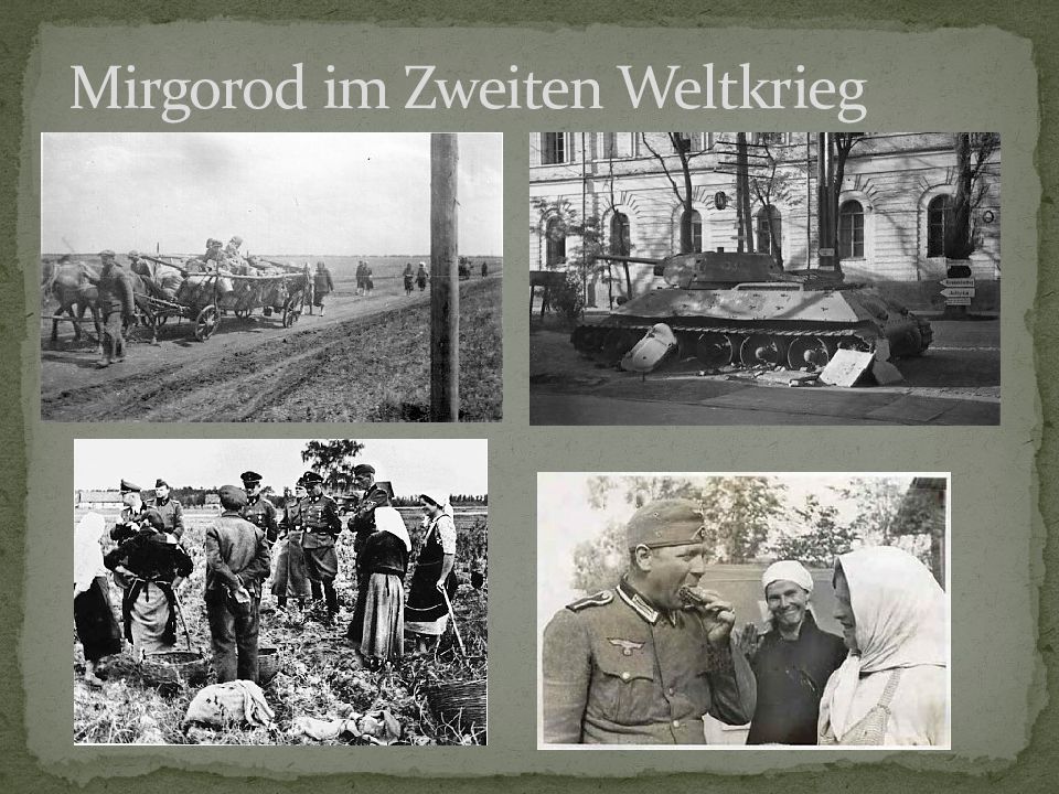 14. September 1941, also 84 Tage nach dem Beginn der Aggression, in der zweiten Hälfte des Tages die Deutschen die Stadt erobert. Die Chronik jener Tage berichtet, dass in den heftigen Kämpfen sowjetische Truppen das Bezirkszentrum von Mirgorod links. Beruf, oder "neue Ordnung", enthalten mehrere Komponenten: die Einrichtung einer neuen Verwaltungseinheit, die Einführung neuer Kontrollen, einer diskriminierenden nationalen Politik. Im Allgemeinen wurden die Leiter des Dritten Reiches bestimmt die besetzten Gebiete der Ukraine in der Kolonie zu verwandeln in Mirgorod Bezirk wurden 6000 Einwohner erschossen Die Deutschen brannten zwei Dörfer - Große Obukhovka und Sakalovka. Während 9-12 November 1941 Straf zwei Dörfer verbrannt - Baranovka und Groß Obukhovka, schossen die letzten Menschen. Unschätzbare Hilfe Menschen von den Besatzern tat Mirgorodska Ärzte bei der Rettung. Im September - Oktober 1941 Mirgorodska Krankenhaus gab es etwa 500 verwundet sowjetischen Soldaten, die in einer angemessenen Weise zu evakuieren nicht in der Lage waren. Unter ihnen waren viele Kommandanten