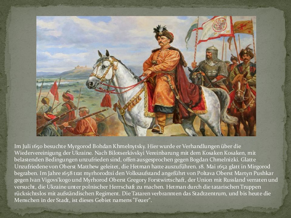 Im Juli 1650 besuchte Myrgorod Bohdan Khmelnytsky. Hier wurde er Verhandlungen über die Wiedervereinigung der Ukraine. Nach Bilotserkivskyi Vereinbarung mit dem Kosaken Kosaken, mit belastenden Bedingungen unzufrieden sind, offen ausgesprochen gegen Bogdan Chmelnizki. Glatte Unzufriedene von Oberst Matthew geleitet, die Hetman hatte auszuführen. 18. Mai 1652 glatt in Mirgorod begraben. Im Jahre 1658 trat myrhorodtsi den Volksaufstand angeführt von Poltava Oberst Martyn Pushkar gegen Ivan Vigovs'kogo und Myrhorod Oberst Gregory Forstwirtschaft, der Union mit Russland verraten und versucht, die Ukraine unter polnischer Herrschaft zu machen. Hetman durch die tatarischen Truppen rücksichtslos mit aufständischen Regiment. Die Tataren verbrannten das Stadtzentrum, und bis heute die Menschen in der Stadt, ist dieses Gebiet namens "Feuer".