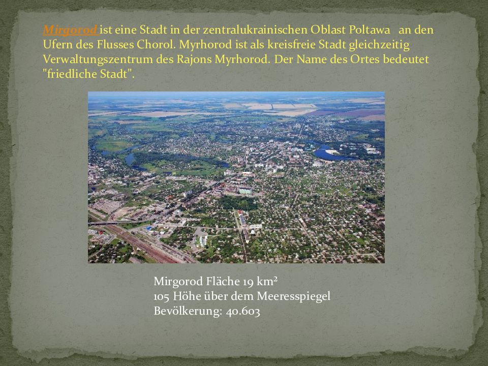 Mirgorod ist eine Stadt in der zentralukrainischen Oblast Poltawa an den Ufern des Flusses Chorol. Myrhorod ist als kreisfreie Stadt gleichzeitig Verwaltungszentrum des Rajons Myrhorod. Der Name des Ortes bedeutet " friedliche Stadt ". Mirgorod Fläche 19 km² 105 Höhe über dem Meeresspiegel Bevölkerung: 40.603