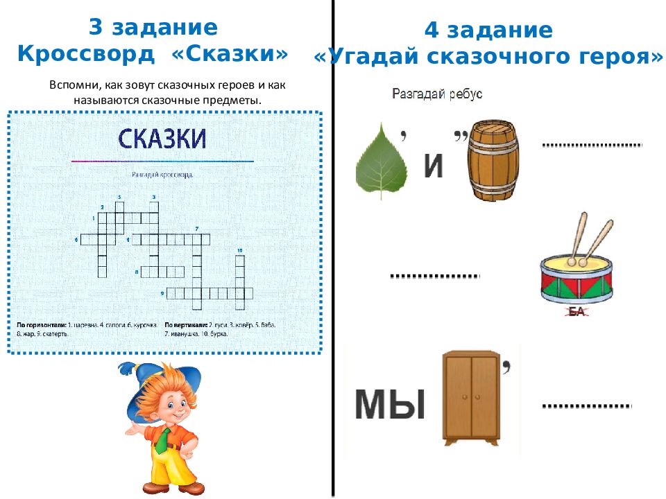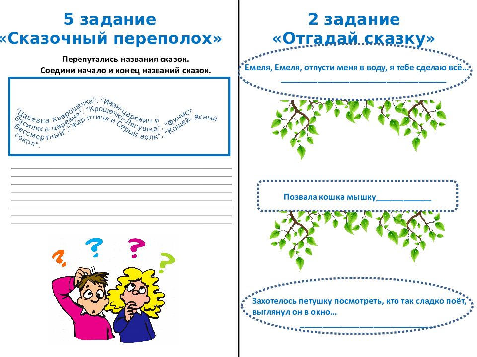 5 задание «Сказочный переполох» 2 задание «Отгадай сказку» Перепутались названия сказок. Соедини начало и конец названий сказок. Емеля, Емеля, отпусти меня в воду, я тебе сделаю всё… _ ____________________________________ Позвала кошка мышку____________ Захотелось петушку посмотреть, кто так сладко поёт, выглянул он в окно… _____________________________