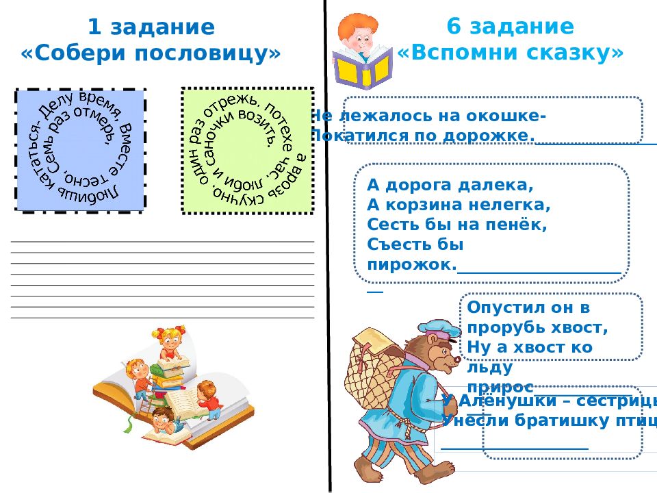 6 задание «Вспомни сказку» Не лежалось на окошке- Покатился по дорожке._______________ А дорога далека, А корзина нелегка, Сесть бы на пенёк, Съесть бы пирожок.______________________ Опустил он в прорубь хвост, Ну а хвост ко льду прирос_______________ У Алёнушки – сестрицы Унесли братишку птицы. __________________ У Алёнушки – сестрицы Унесли братишку птицы. 1 задание «Собери пословицу»