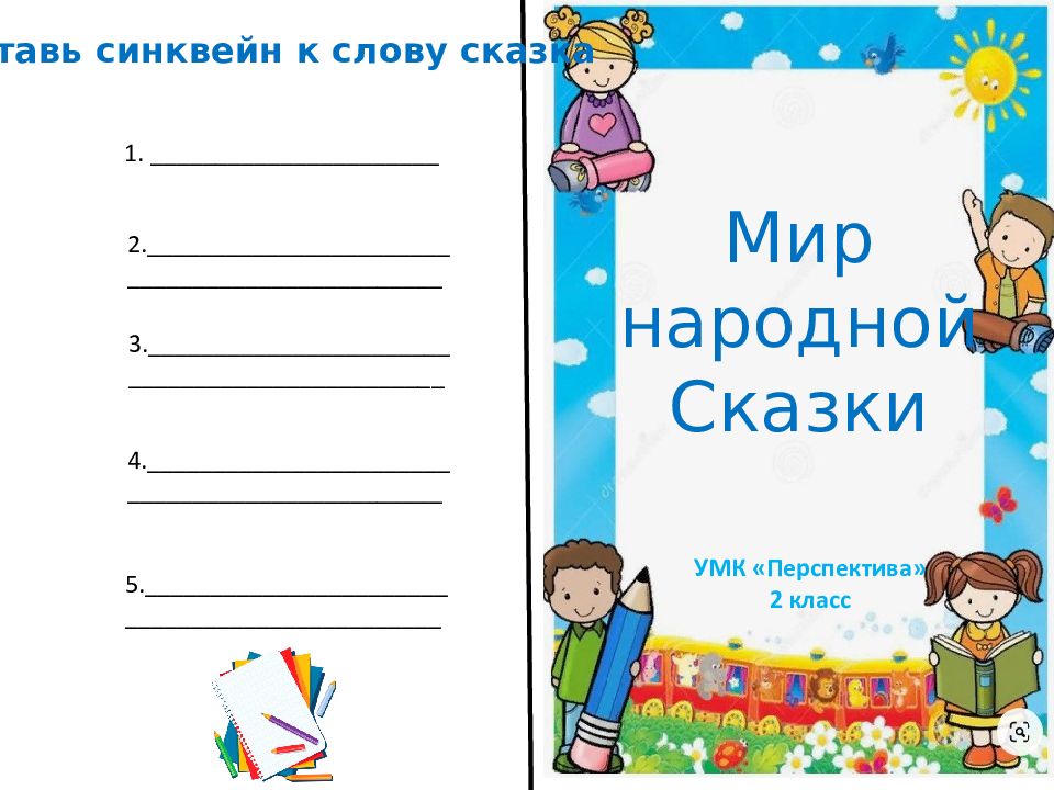 Мир н ародной Сказки УМК «Перспектива» 2 класс Составь синквейн к слову сказка 1. ______________________ 2._______________________ ________________________ 3._______________________ ________________________ 4._______________________ ________________________ 5._______________________ ________________________