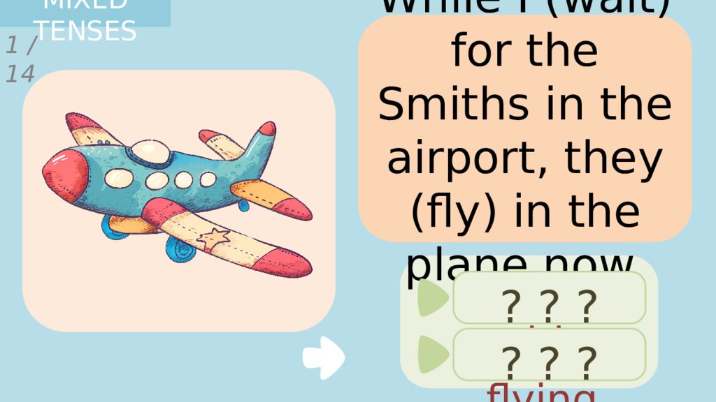 While I (wait) for the Smiths in the airport, they (fly) in the plane now. am waiting are flying 1 / 14 MIXED TENSES ? ? ? ? ? ?