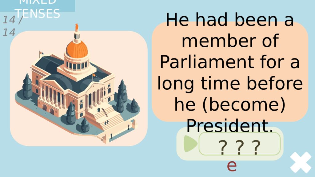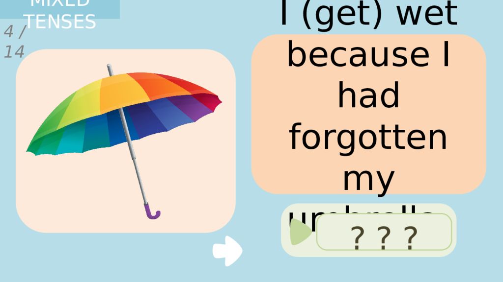 I ( get) wet because I had forgotten my umbrella. got 4 / 14 MIXED TENSES ? ? ?
