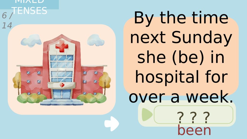 By the time next Sunday she ( be) in hospital for over a week. will have been 6 / 14 MIXED TENSES ? ? ?