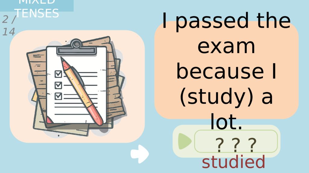 I passed the exam because I ( study) a lot. had studied 2 / 14 MIXED TENSES ? ? ?