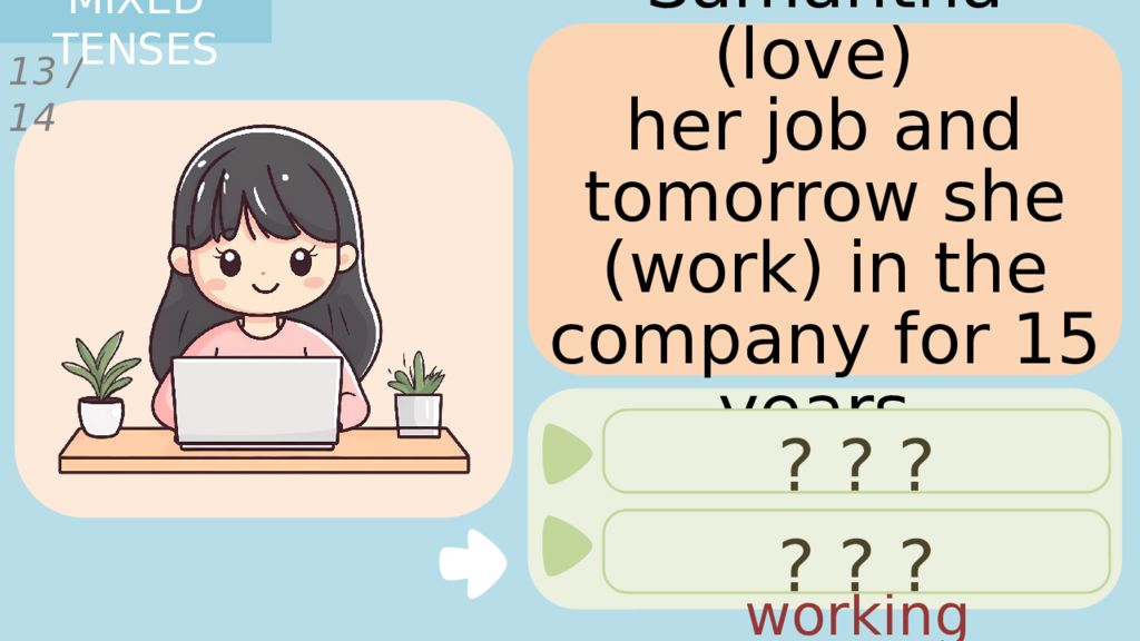 Samantha ( love) her job and tomorrow she ( work) in the company for 15 years. loves will have been working 13 / 14 MIXED TENSES ? ? ? ? ? ?
