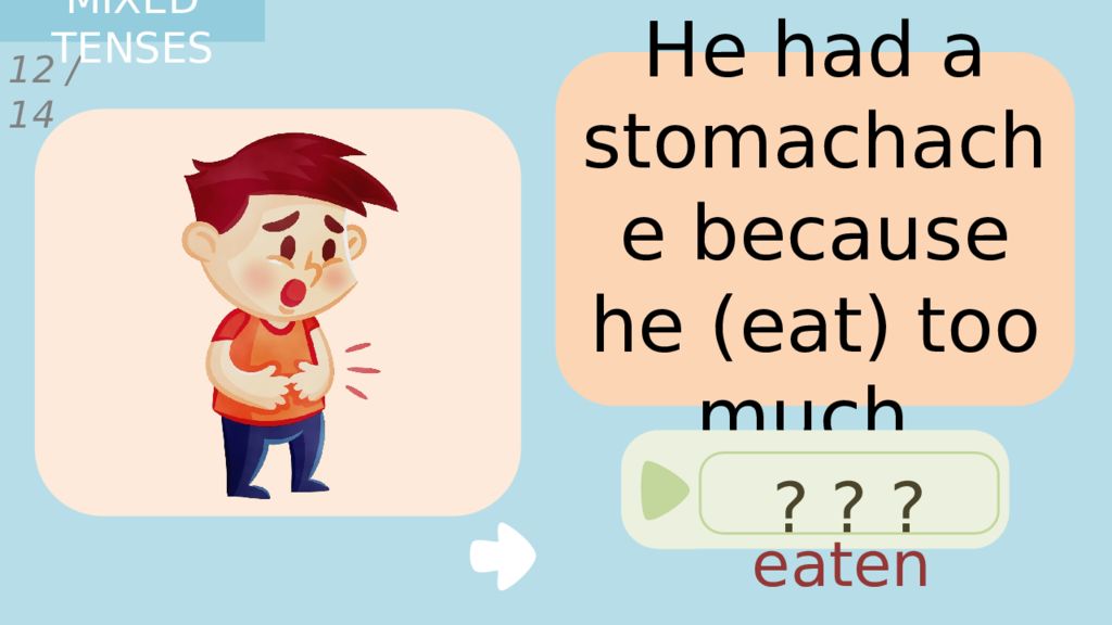 He had a stomachache because he ( eat) too much. 12 / 14 MIXED TENSES had eaten ? ? ?