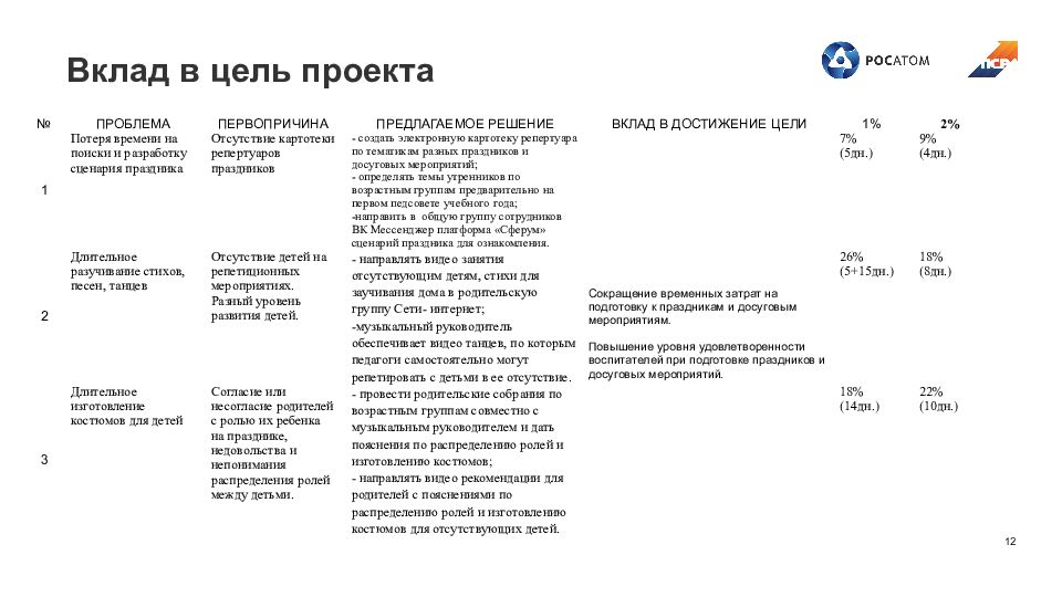 № ПРОБЛЕМА ПЕРВОПРИЧИНА ПРЕДЛАГАЕМОЕ РЕШЕНИЕ ВКЛАД В ДОСТИЖЕНИЕ ЦЕЛИ 1% 2% 1 Потеря времени на поиски и разработку сценария праздника Отсутствие картотеки репертуаров праздников - создать электронную картотеку репертуара по тематикам разных праздников и досуговых мероприятий; - определять темы утренников по возрастным группам предварительно на первом педсовете учебного года; -направить в общую группу сотрудников ВК Мессенджер платформа « Сферум » сценарий праздника для ознакомления. Сокращение временных затрат на подготовку к праздникам и досуговым мероприятиям. Повышение уровня удовлетворенности воспитателей при подготовке праздников и досуговых мероприятий. 7% (5дн.) 9% (4дн.) 2 Длительное разучивание стихов, песен, танцев Отсутствие детей на репетиционных мероприятиях. Разный уровень развития детей. - направлять видео занятия отсутствующим детям, стихи для заучивания дома в родительскую группу Сети- интернет; -музыкальный руководитель обеспечивает видео танцев, по которым педагоги самостоятельно могут репетировать с детьми в ее отсутствие. 26% (5+15дн.) 18% (8дн.) 3 Длительное изготовление костюмов для детей Согласие или несогласие родителей с ролью их ребенка на празднике, недовольства и непонимания распределения ролей между детьми. - провести родительские собрания по возрастным группам совместно с музыкальным руководителем и дать пояснения по распределению ролей и изготовлению костюмов; - направлять видео рекомендации для родителей с пояснениями по распределению ролей и изготовлению костюмов для отсутствующих детей. 18% (14дн.) 22% (10дн.)