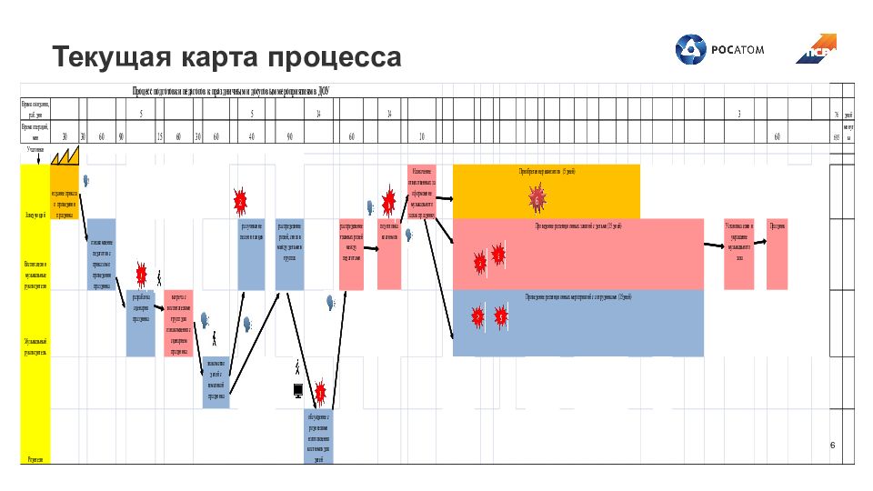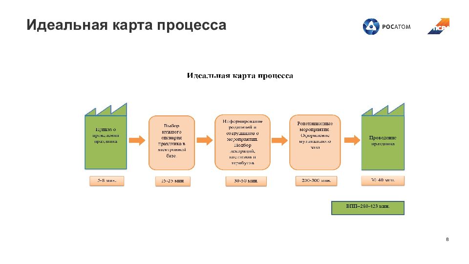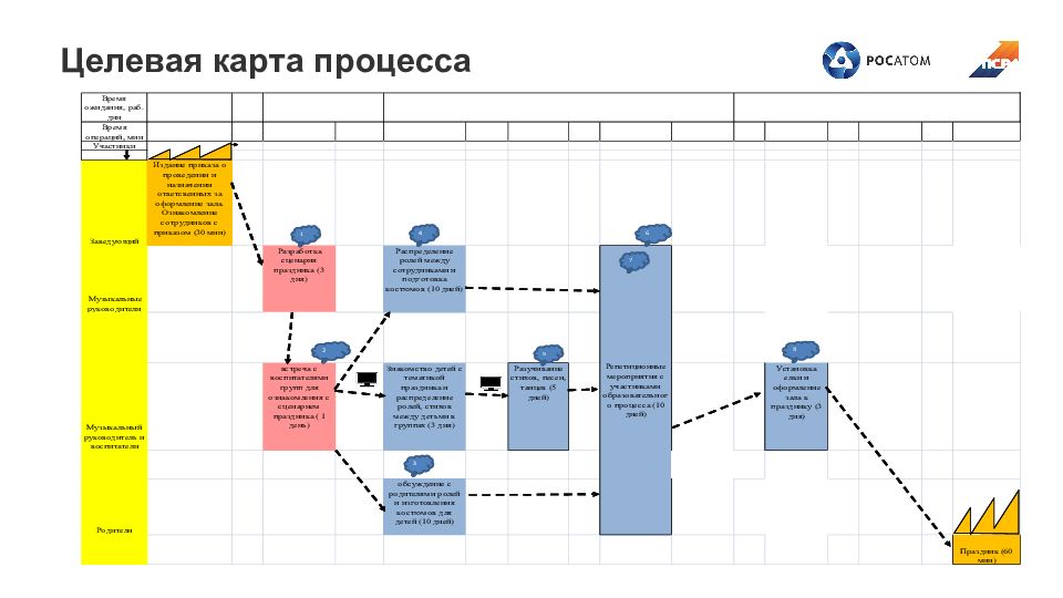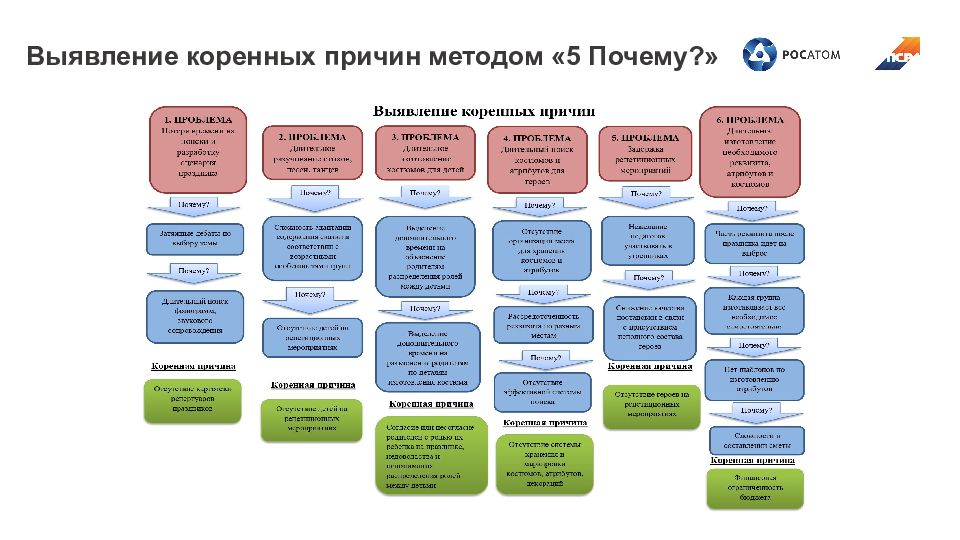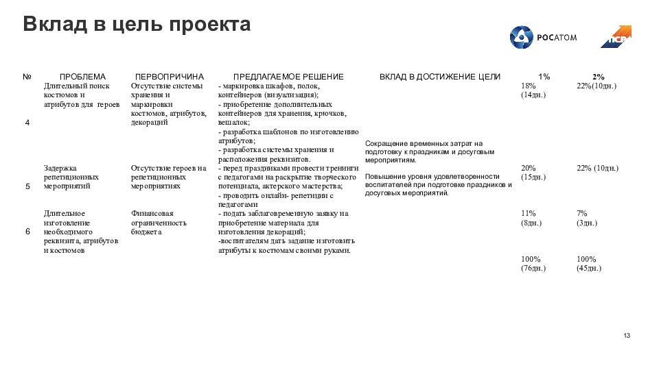 № ПРОБЛЕМА ПЕРВОПРИЧИНА ПРЕДЛАГАЕМОЕ РЕШЕНИЕ ВКЛАД В ДОСТИЖЕНИЕ ЦЕЛИ 1% 2% 4 Длительный поиск костюмов и атрибутов для героев Отсутствие системы хранения и маркировки костюмов, атрибутов, декораций - маркировка шкафов, полок, контейнеров (визуализация); - приобретение дополнительных контейнеров для хранения, крючков, вешалок; - разработка шаблонов по изготовлению атрибутов; - разработка системы хранения и расположения реквизитов. Сокращение временных затрат на подготовку к праздникам и досуговым мероприятиям. Повышение уровня удовлетворенности воспитателей при подготовке праздников и досуговых мероприятий. 18% (14дн.) 22%(10дн.) 5 Задержка репетиционных мероприятий Отсутствие героев на репетиционных мероприятиях - перед праздниками провести тренинги с педагогами на раскрытие творческого потенциала, актерского мастерства; - проводить онлайн - репетиции с педагогами 20% (15дн.) 22% (10дн.) 6 Длительное изготовление необходимого реквизита, атрибутов и костюмов Финансовая ограниченность бюджета - подать заблаговременную заявку на приобретение материала для изготовления декораций; -воспитателям дать задание изготовить атрибуты к костюмам своими руками. 11% (8дн.) 7% (3дн.) 100% (76дн.) 100% (45дн.)