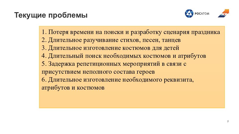 6 1. Потеря времени на поиски и разработку сценария праздника 2. Длительное разучивание стихов, песен, танцев 3. Длительное изготовление костюмов для детей 4. Длительный поиск необходимых костюмов и атрибутов 5. Задержка репетиционных мероприятий в связи с присутствием неполного состава героев 6. Длительное изготовление необходимого реквизита, атрибутов и костюмов