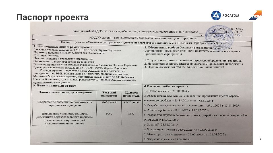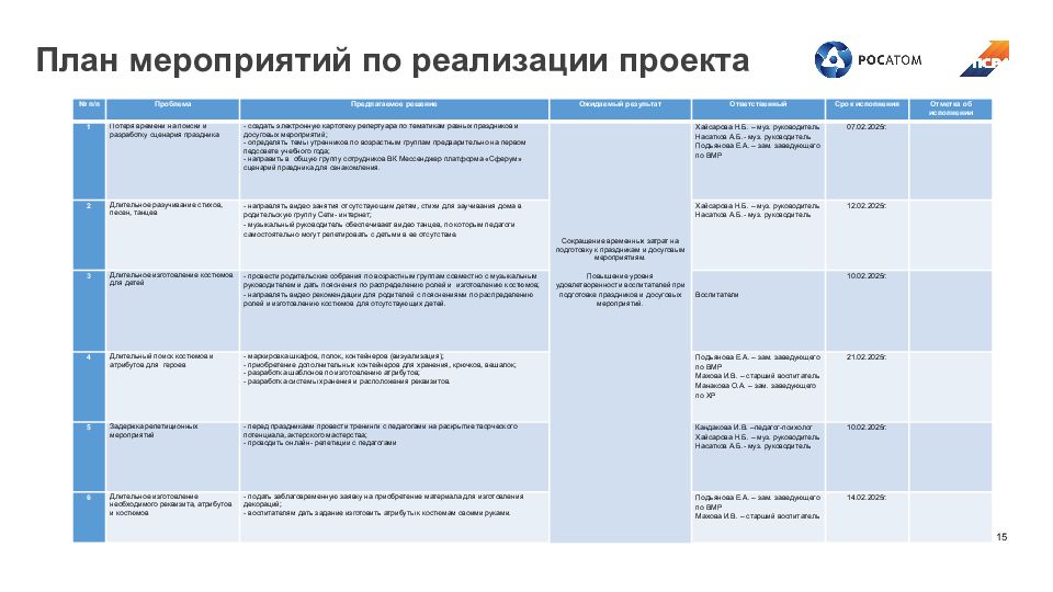 № п/п Проблема Предлагаемое решение Ожидаемый результат Ответственный Срок исполнения Отметка об исполнении 1 Потеря времени на поиски и разработку сценария праздника - создать электронную картотеку репертуара по тематикам разных праздников и досуговых мероприятий; - определять темы утренников по возрастным группам предварительно на первом педсовете учебного года; - направить в общую группу сотрудников ВК Мессенджер платформа « Сферум » сценарий праздника для ознакомления. Сокращение временных затрат на подготовку к праздникам и досуговым мероприятиям. Повышение уровня удовлетворенности воспитателей при подготовке праздников и досуговых мероприятий. Хайсарова Н.Б. – муз. руководитель Насатков А.Б.- муз. руководитель Подъянова Е.А. – зам. заведующего по ВМР 07.02.2025г. 2 Длительное разучивание стихов, песен, танцев - направлять видео занятия отсутствующим детям, стихи для заучивания дома в родительскую группу Сети- интернет; - музыкальный руководитель обеспечивает видео танцев, по которым педагоги самостоятельно могут репетировать с детьми в ее отсутствие. Хайсарова Н.Б. – муз. руководитель Насатков А.Б.- муз. руководитель 12.02.2025г. 3 Длительное изготовление костюмов для детей - провести родительские собрания по возрастным группам совместно с музыкальным руководителем и дать пояснения по распределению ролей и изготовлению костюмов; - направлять видео рекомендации для родителей с пояснениями по распределению ролей и изготовлению костюмов для отсутствующих детей. Воспитатели 10.02.2025г. 4 Длительный поиск костюмов и атрибутов для героев - маркировка шкафов, полок, контейнеров (визуализация); - приобретение дополнительных контейнеров для хранения, крючков, вешалок; - разработка шаблонов по изготовлению атрибутов; - разработка системы хранения и расположения реквизитов. Подъянова Е.А. – зам. заведующего по ВМР Махова И.В. – старший воспитатель Манакова О.А. – зам. заведующего по ХР 21.02.2025г. 5 Задержка репетиционных мероприятий - перед праздниками провести тренинги с педагогами на раскрытие творческого потенциала, актерского мастерства; - проводить онлайн- репетиции с педагогами Кандакова И.В. –педагог-психолог Хайсарова Н.Б. – муз. руководитель Насатков А.Б.- муз. руководитель 10.02.2025г. 6 Длительное изготовление необходимого реквизита, атрибутов и костюмов - подать заблаговременную заявку на приобретение материала для изготовления декораций; - воспитателям дать задание изготовить атрибуты к костюмам своими руками. Подъянова Е.А. – зам. заведующего по ВМР Махова И.В. – старший воспитатель 14.02.2025г.