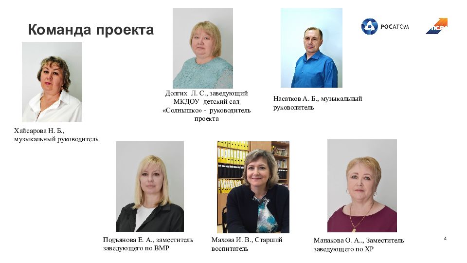 Долгих Л. С., заведующий МКДОУ детский сад «Солнышко» - руководитель проекта Подъянова Е. А., заместитель заведующего по ВМР Хайсарова Н. Б., музыкальный руководитель Насатков А. Б., музыкальный руководитель Махова И. В., Старший воспитатель Манакова О. А.., Заместитель заведующего по ХР