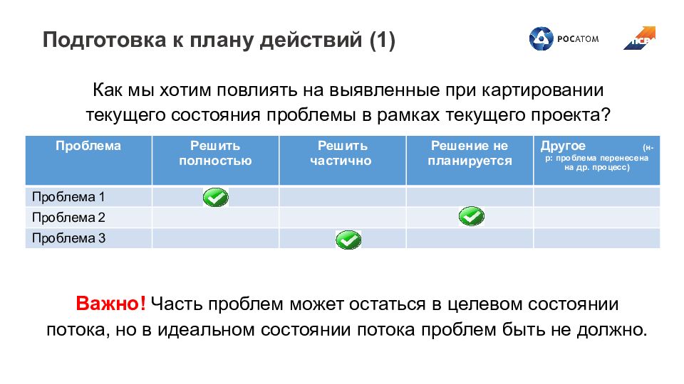 Подготовка к плану действий (1) Как мы хотим повлиять на выявленные при картировании текущего состояния проблемы в рамках текущего проекта? Проблема Решить полностью Решить частично Решение не планируется Другое (н-р: проблема перенесена на др. процесс) Проблема 1 Проблема 2 Проблема 3 Важно! Часть проблем может остаться в целевом состоянии потока, но в идеальном состоянии потока проблем быть не должно.