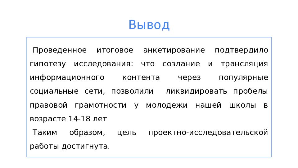 Проведенное итоговое анкетирование подтвердило гипотезу исследования: что создание и трансляция информационного контента через популярные социальные сети, позволили ликвидировать пробелы правовой грамотности у молодежи нашей школы в возрасте 14-18 лет Таким образом, цель проектно-исследовательской работы достигнута.
