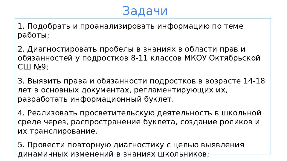 1. Подобрать и проанализировать информацию по теме работы; 2. Диагностировать пробелы в знаниях в области прав и обязанностей у подростков 8-11 классов МКОУ Октябрьской СШ №9; 3. Выявить права и обязанности подростков в возрасте 14-18 лет в основных документах, регламентирующих их, разработать информационный буклет. 4. Реализовать просветительскую деятельность в школьной среде через, распространение буклета, создание роликов и их транслирование. 5. Провести повторную диагностику с целью выявления динамичных изменений в знаниях школьников;