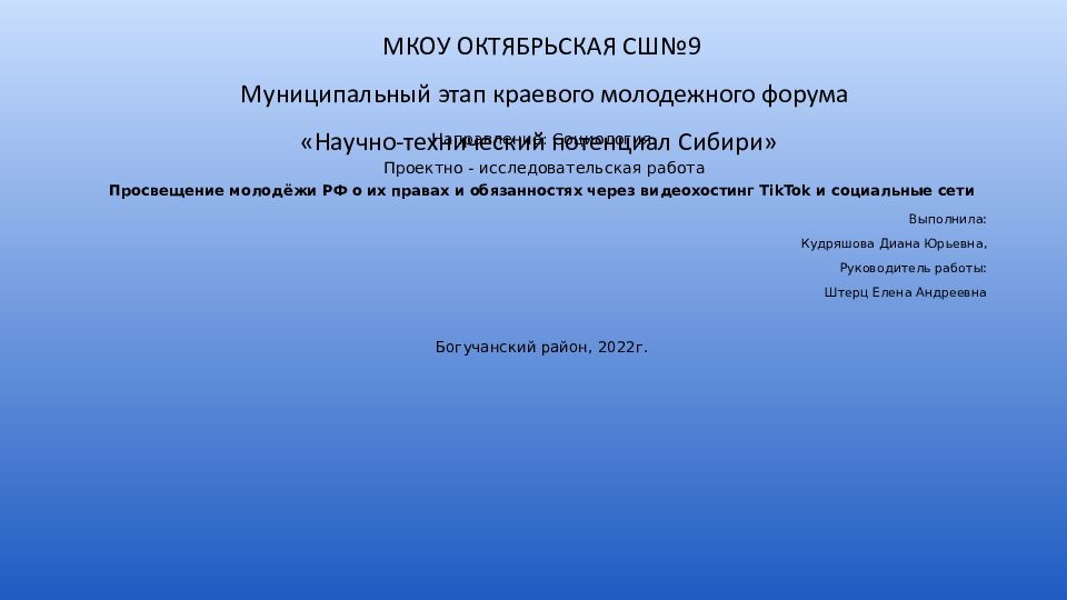 Направление: Социология Проектно - исследовательская работа Просвещение молодёжи РФ о их правах и обязанностях через видеохостинг TikTok и социальные сети Выполнила: Кудряшова Диана Юрьевна, Руководитель работы: Штерц Елена Андреевна Богучанский район, 2022г.