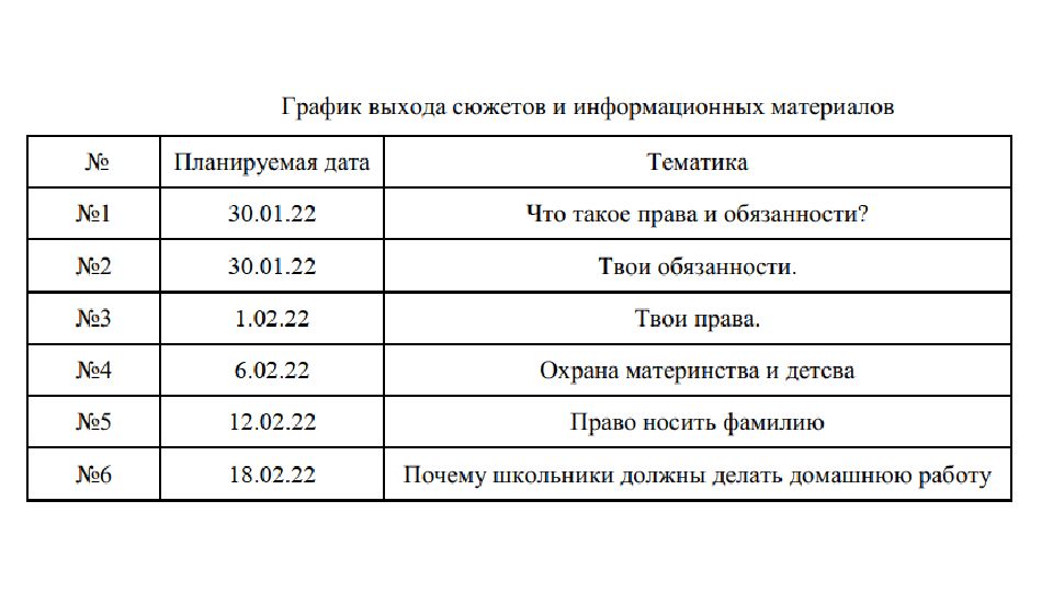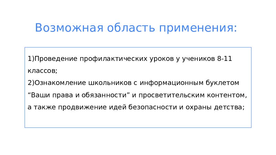 1)Проведение профилактических уроков у учеников 8-11 классов; 2)Ознакомление школьников с информационным буклетом “Ваши права и обязанности” и просветительским контентом, а также продвижение идей безопасности и охраны детства;