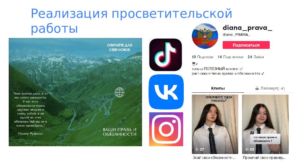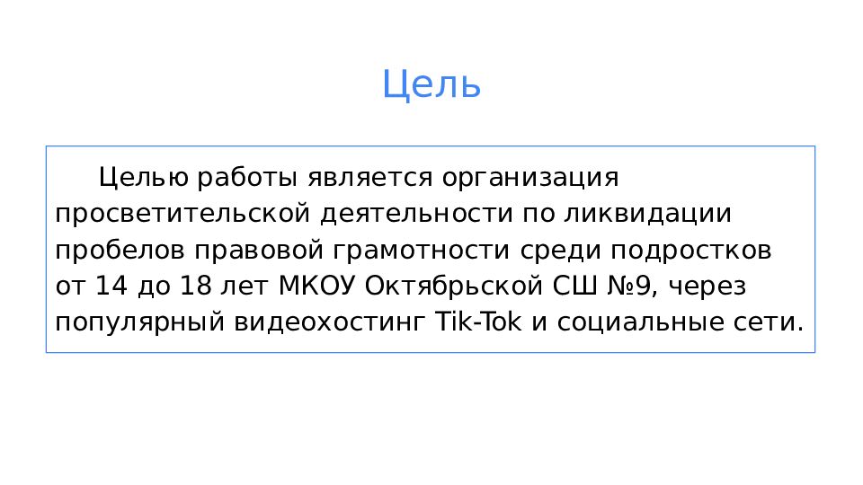 Целью работы является организация просветительской деятельности по ликвидации пробелов правовой грамотности среди подростков от 14 до 18 лет МКОУ Октябрьской СШ №9, через популярный видеохостинг Tik-Tok и социальные сети.