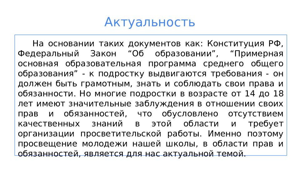На основании таких документов как: Конституция РФ, Федеральный Закон “Об образовании”, “Примерная основная образовательная программа среднего общего образования” - к подростку выдвигаются требования - он должен быть грамотным, знать и соблюдать свои права и обязанности. Но многие подростки в возрасте от 14 до 18 лет имеют значительные заблуждения в отношении своих прав и обязанностей, что обусловлено отсутствием качественных знаний в этой области и требует организации просветительской работы. Именно поэтому просвещение молодежи нашей школы, в области прав и обязанностей, является для нас актуальной темой.
