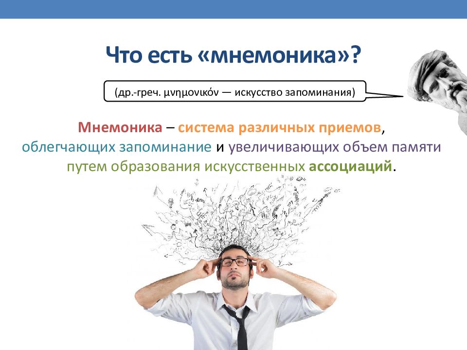 Мнемоника – система различных приемов, облегчающих запоминание и увеличивающих объем памяти путем образования искусственных ассоциаций. (др.-греч. μνημονικόν — искусство запоминания)