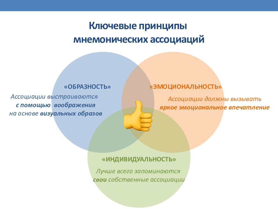 «ОБРАЗНОСТЬ» «ЭМОЦИОНАЛЬНОСТЬ» «ИНДИВИДУАЛЬНОСТЬ» Ассоциации выстраиваются с помощью воображения на основе визуальных образов Ассоциации должны вызывать яркое эмоциональное впечатление Лучше всего запоминаются свои собственные ассоциации