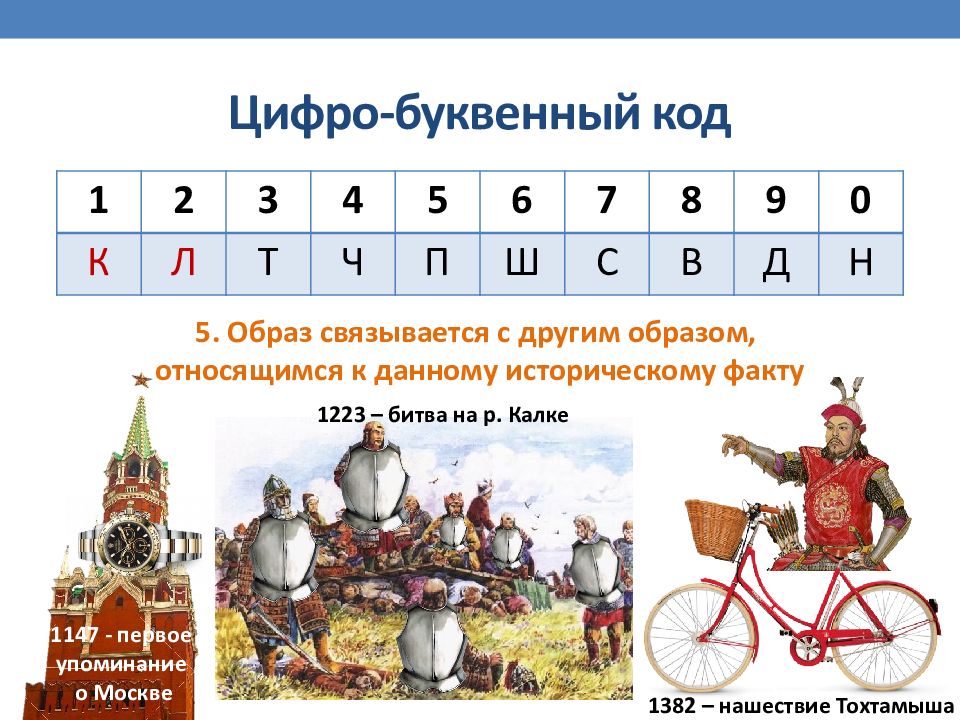 1 2 3 4 5 6 7 8 9 0 К Л Т Ч П Ш С В Д Н 5. Образ связывается с другим образом, относящимся к данному историческому факту 1147 - первое упоминание о Москве 1223 – битва на р. Калке 1382 – нашествие Тохтамыша