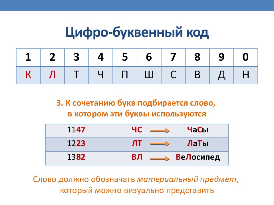 1 2 3 4 5 6 7 8 9 0 К Л Т Ч П Ш С В Д Н 3. К сочетанию букв подбирается слово, в котором эти буквы используются 11 47 ЧС Ч а С ы 12 23 ЛТ Л а Т ы 13 82 ВЛ В е Л осипед Слово должно обозначать материальный предмет, который можно визуально представить