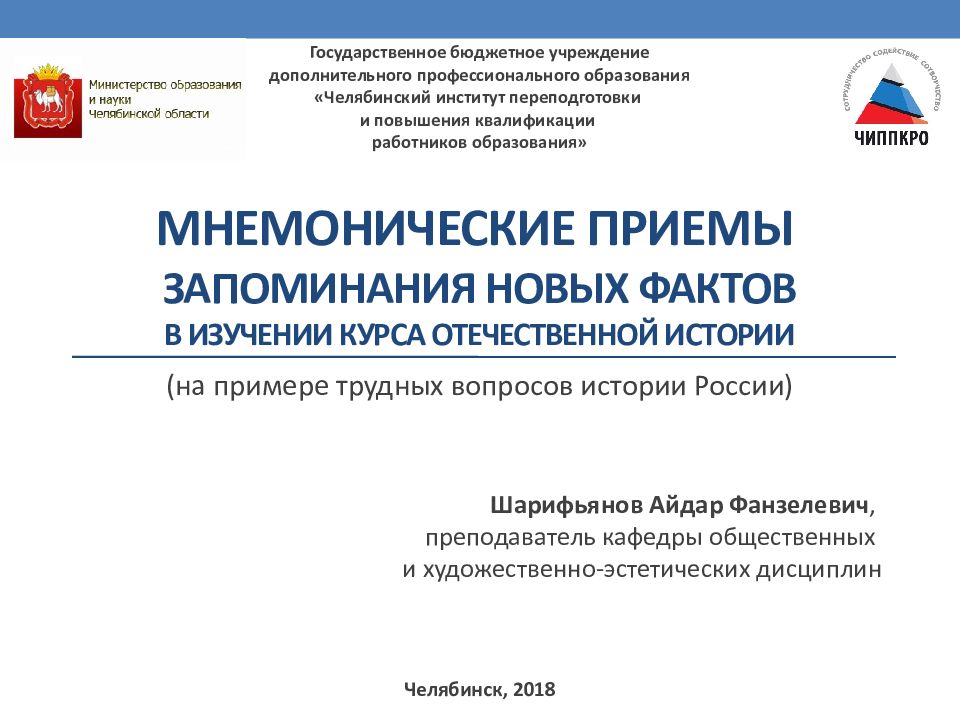 Шарифьянов Айдар Фанзелевич, преподаватель кафедры общественных и художественно-эстетических дисциплин Челябинск, 2018 Государственное бюджетное учреждение дополнительного профессионального образования «Челябинский институт переподготовки и повышения квалификации работников образования» (на примере трудных вопросов истории России)