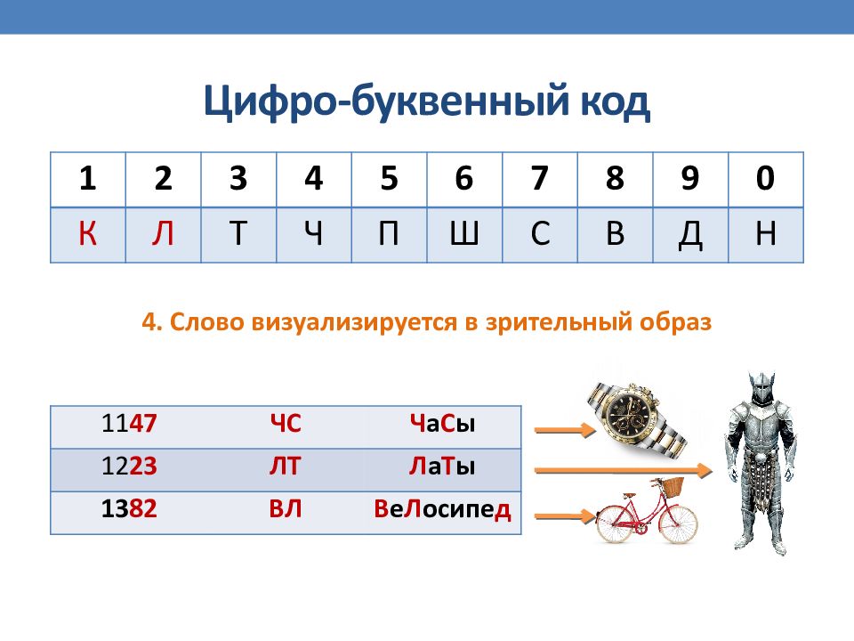 1 2 3 4 5 6 7 8 9 0 К Л Т Ч П Ш С В Д Н 4. Слово визуализируется в зрительный образ 11 47 ЧС Ч а С ы 12 23 ЛТ Л а Т ы 13 82 ВЛ В е Л осипе д