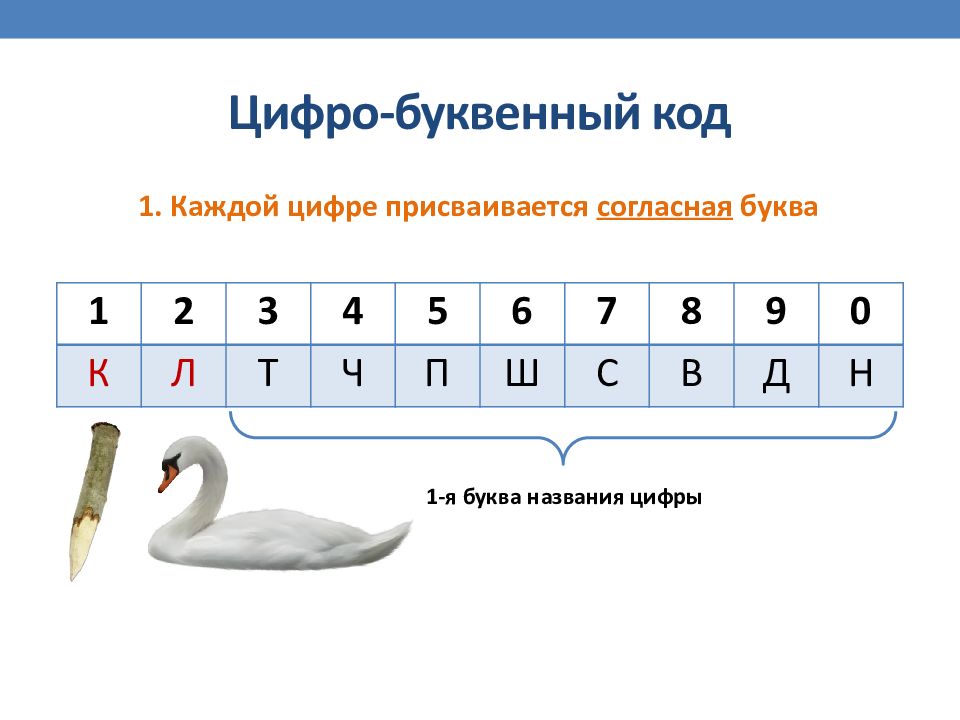 1 2 3 4 5 6 7 8 9 0 К Л Т Ч П Ш С В Д Н 1. Каждой цифре присваивается согласная буква 1-я буква названия цифры