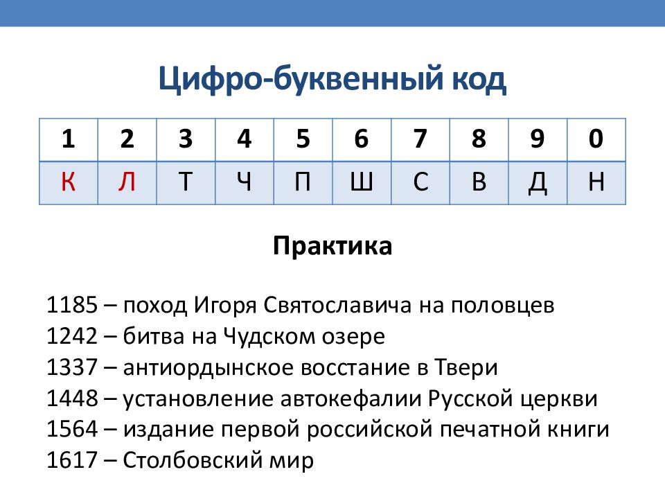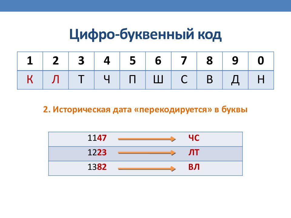 1 2 3 4 5 6 7 8 9 0 К Л Т Ч П Ш С В Д Н 2. Историческая дата «перекодируется» в буквы 11 47 ЧС 12 23 ЛТ 13 82 ВЛ