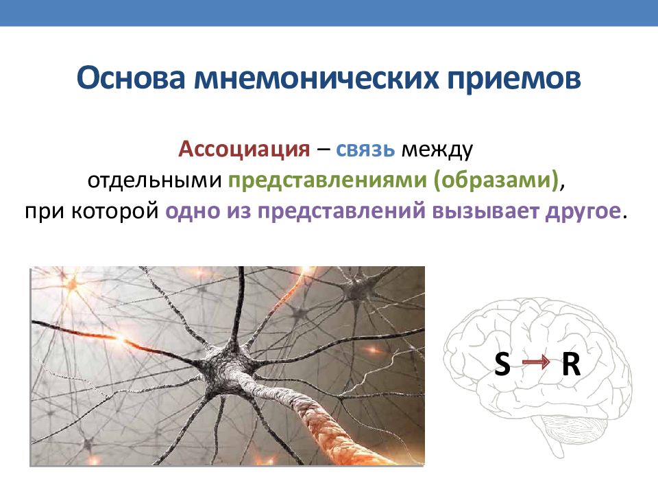 Ассоциация – связь между отдельными представлениями (образами), при которой одно из представлений вызывает другое. S R