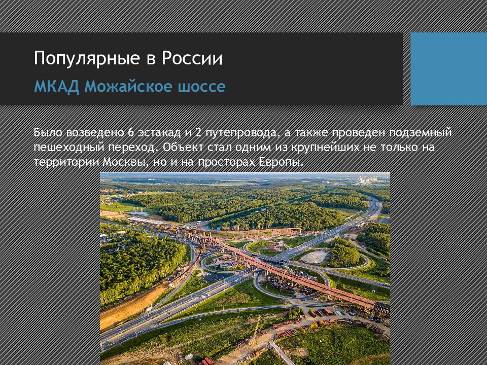 Популярные в России МКАД Можайское шоссе Б ыло возведено 6 эстакад и 2 путепровода, а также проведен подземный пешеходный переход. Объект стал одним из крупнейших не только на территории Москвы, но и на просторах Европы.