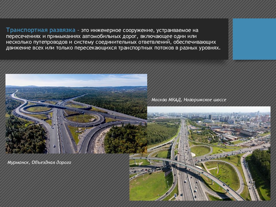 Транспортная развязка – это инженерное сооружение, устраиваемое на пересечениях и примыканиях автомобильных дорог, включающее один или несколько путепроводов и систему соединительных ответвлений, обеспечивающих движение всех или только пересекающихся транспортных потоков в разных уровнях. Москва МКАД, Новорижское шоссе Мурманск, Объездная дорога