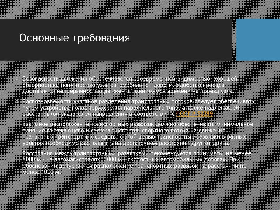 Безопасность движения обеспечивается своевременной видимостью, хорошей обзорностью, понятностью узла автомобильной дороги. Удобство проезда достигается непрерывностью движения, минимумов времени на проезд узла. Распознаваемость участков разделения транспортных потоков следует обеспечивать путем устройства полос торможения параллельного типа, а также надлежащей расстановкой указателей направления в соответствии с ГОСТ Р 52289 Взаимное расположение транспортных развязок должно обеспечивать минимальное влияние въезжающего и съезжающего транспортного потока на движение транзитных транспортных средств, с этой целью транспортные развязки в разных уровнях необходимо располагать на достаточном расстоянии друг от друга. Расстояния между транспортными развязками рекомендуется принимать: не менее 5000 м - на автомагистралях, 3000 м - скоростных автомобильных дорогах. При обосновании допускается расположение транспортных развязок на расстоянии не менее 1000 м.