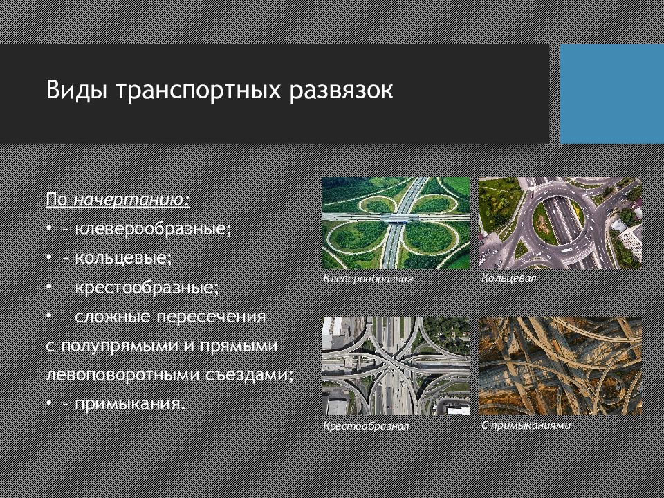 По начертанию: – клеверообразные ; – кольцевые; – крестообразные; – сложные пересечения с полупрямыми и прямыми левоповоротными съездами; – примыкания. Клеверообразная Кольцевая Крестообразная С примыканиями