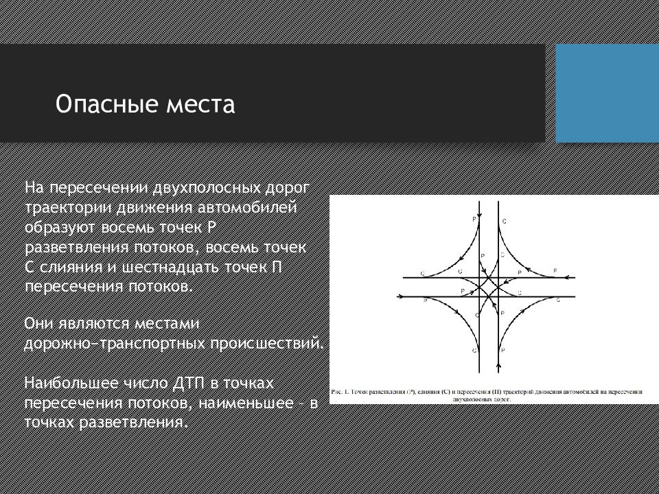 На пересечении двухполосных дорог траектории движения автомобилей образуют восемь точек Р разветвления потоков, восемь точек С слияния и шестнадцать точек П пересечения потоков. Они являются местами дорожно−транспортных происшествий. Наибольшее число ДТП в точках пересечения потоков, наименьшее – в точках разветвления. Опасные места