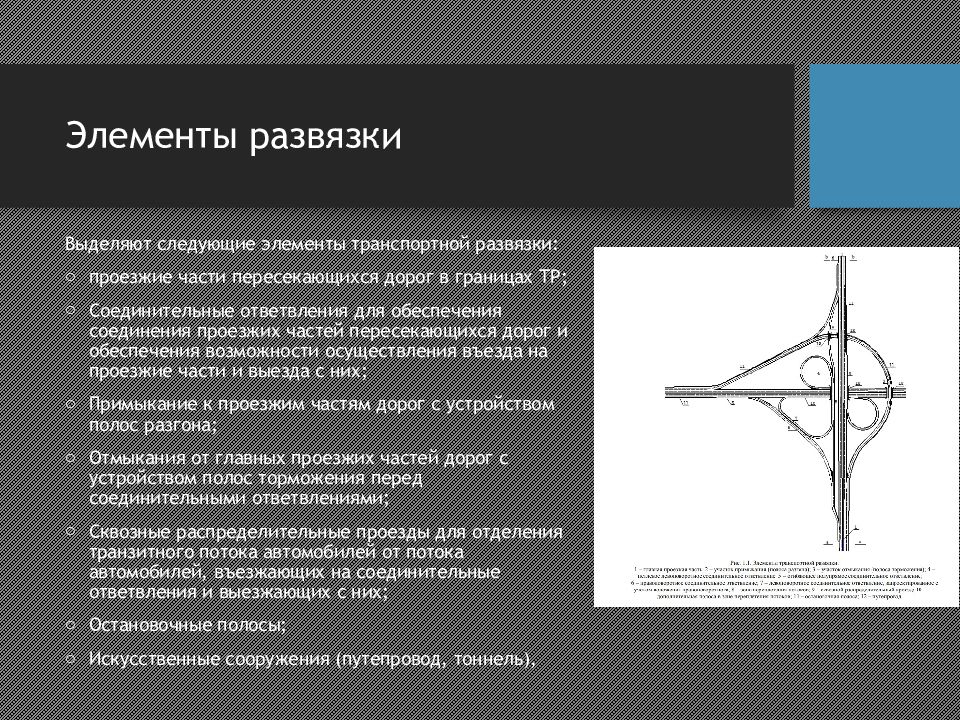 Выделяют следующие элементы транспортной развязки: проезжие части пересекающихся дорог в границах ТР ; Соединительные ответвления для обеспечения соединения проезжих частей пересекающихся дорог и обеспечения возможности осуществления въезда на проезжие части и выезда с них ; Примыкание к проезжим частям дорог с устройством полос разгона; Отмыкания от главных проезжих частей дорог с устройством полос торможения перед соединительными ответвлениями; Сквозные распределительные проезды для отделения транзитного потока автомобилей от потока автомобилей, въезжающих на соединительные ответвления и выезжающих с них; Остановочные полосы; Искусственные сооружения (путепровод, тоннель),
