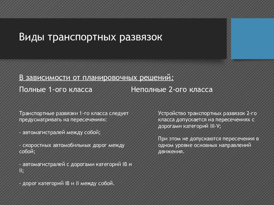 Виды транспортных развязок В зависимости от планировочных решений : Полные 1-ого класса Неполные 2-ого класса Транспортные развязки 1-го класса следует предусматривать на пересечениях: - автомагистралей между собой; - скоростных автомобильных дорог между собой; - автомагистралей с дорогами категорий IB и II; - дорог категорий IB и II между собой. Устройство транспортных развязок 2-го класса допускается на пересечениях с дорогами категорий III-V; При этом не допускаются пересечения в одном уровне основных направлений движения.