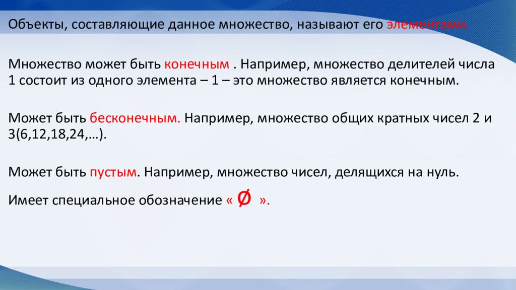 Объекты, составляющие данное множество, называют его элементами. Множество может быть конечным. Например, множество делителей числа 1 состоит из одного элемента – 1 – это множество является конечным. Может быть бесконечным. Например, множество общих кратных чисел 2 и 3(6,12,18,24,…). Может быть пустым. Например, множество чисел, делящихся на нуль. Имеет специальное обозначение « ø ».